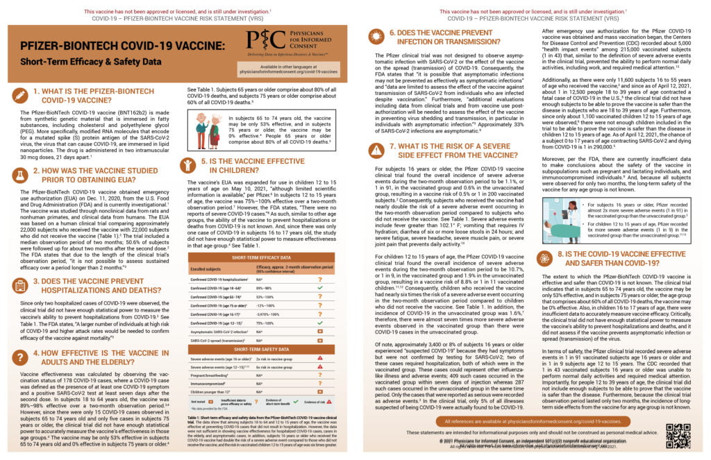 Citation: Physicians for Informed Consent. Pfizer-BioNTech COVID-19 Vaccine: Short-Term Efficacy & Safety Data. Jun 2021. https://www.physiciansforinformedconsent.org/COVID-19-vaccines.